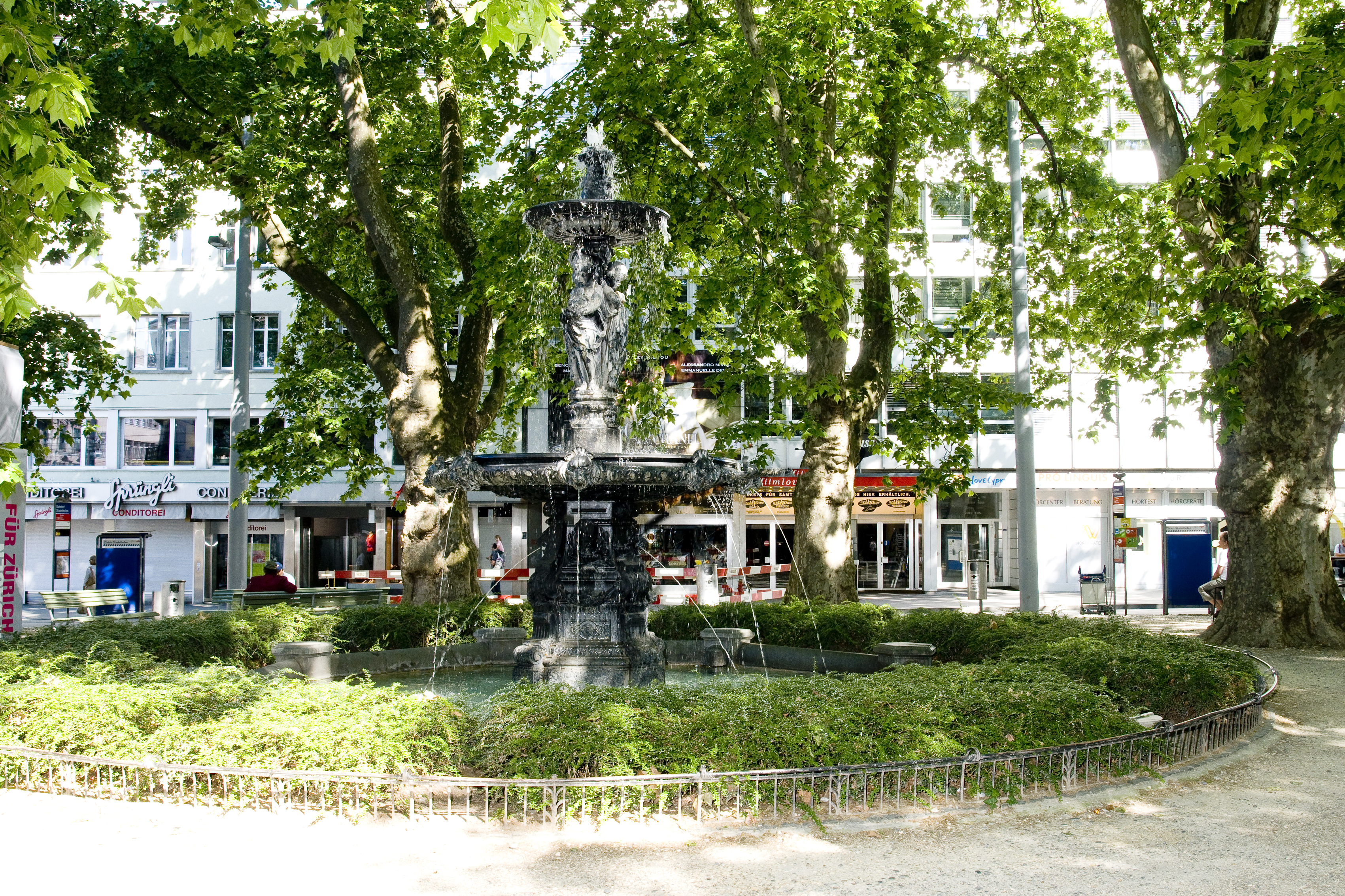 - Dies ist der Springbrunnen am Stadelhofenplatz in Zürich.
