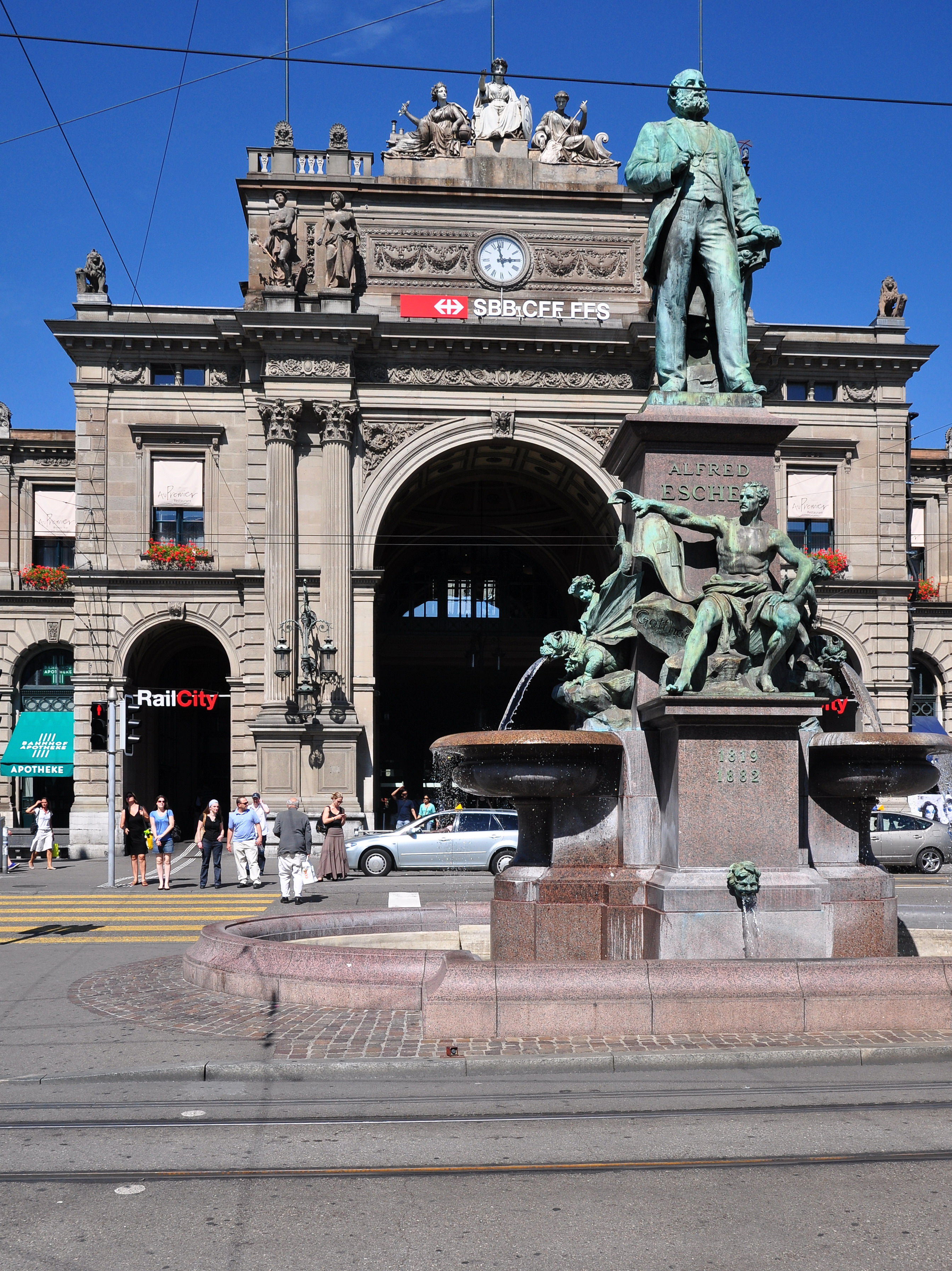 - Alfred Escher monumental fountain, sculpted by Richard Kissling, on Bahnhofplatz situated at Hauptbahnhof in Zürich (Switzerland)