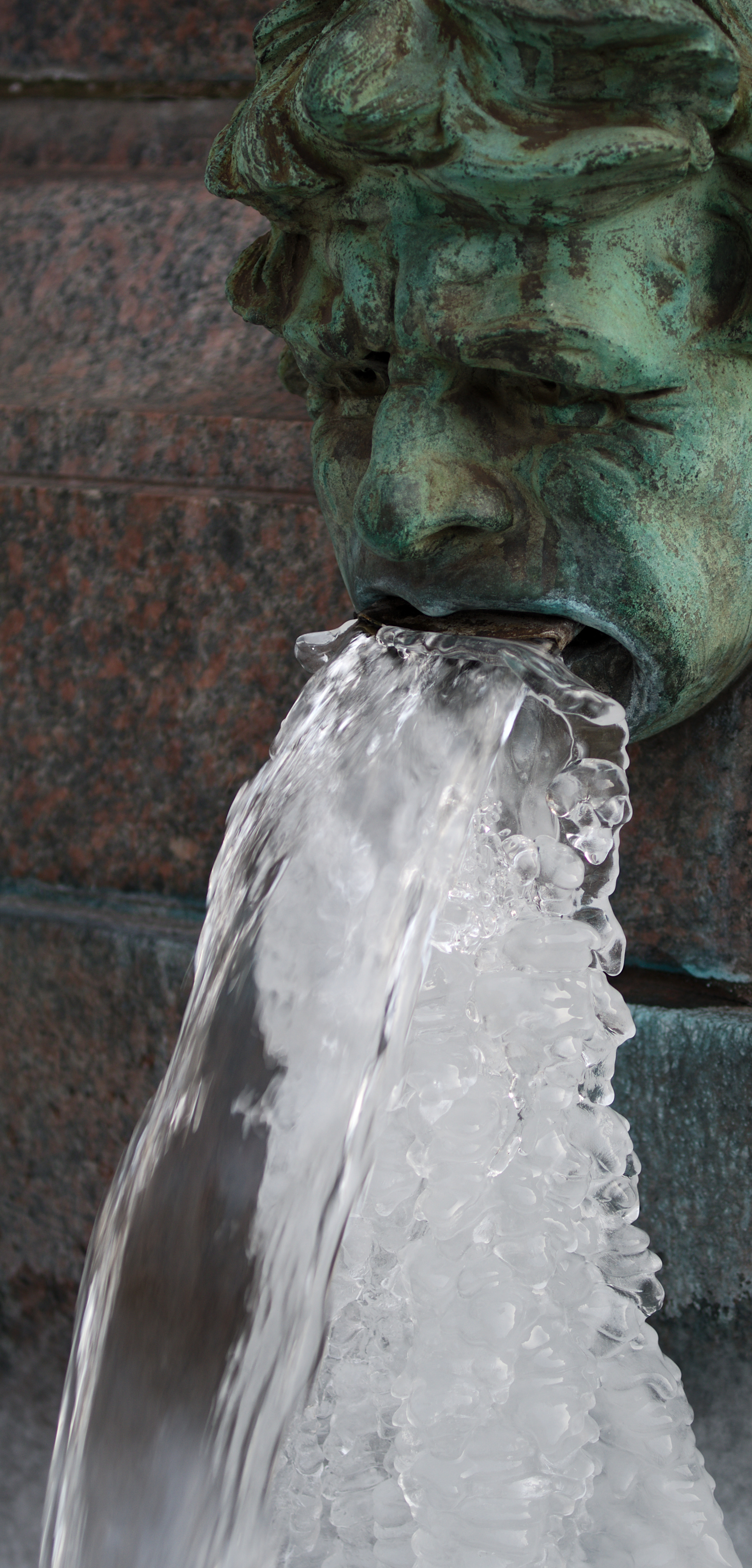 - Detail from a fountain showing a head in green metal with ice coming out of its mouth.