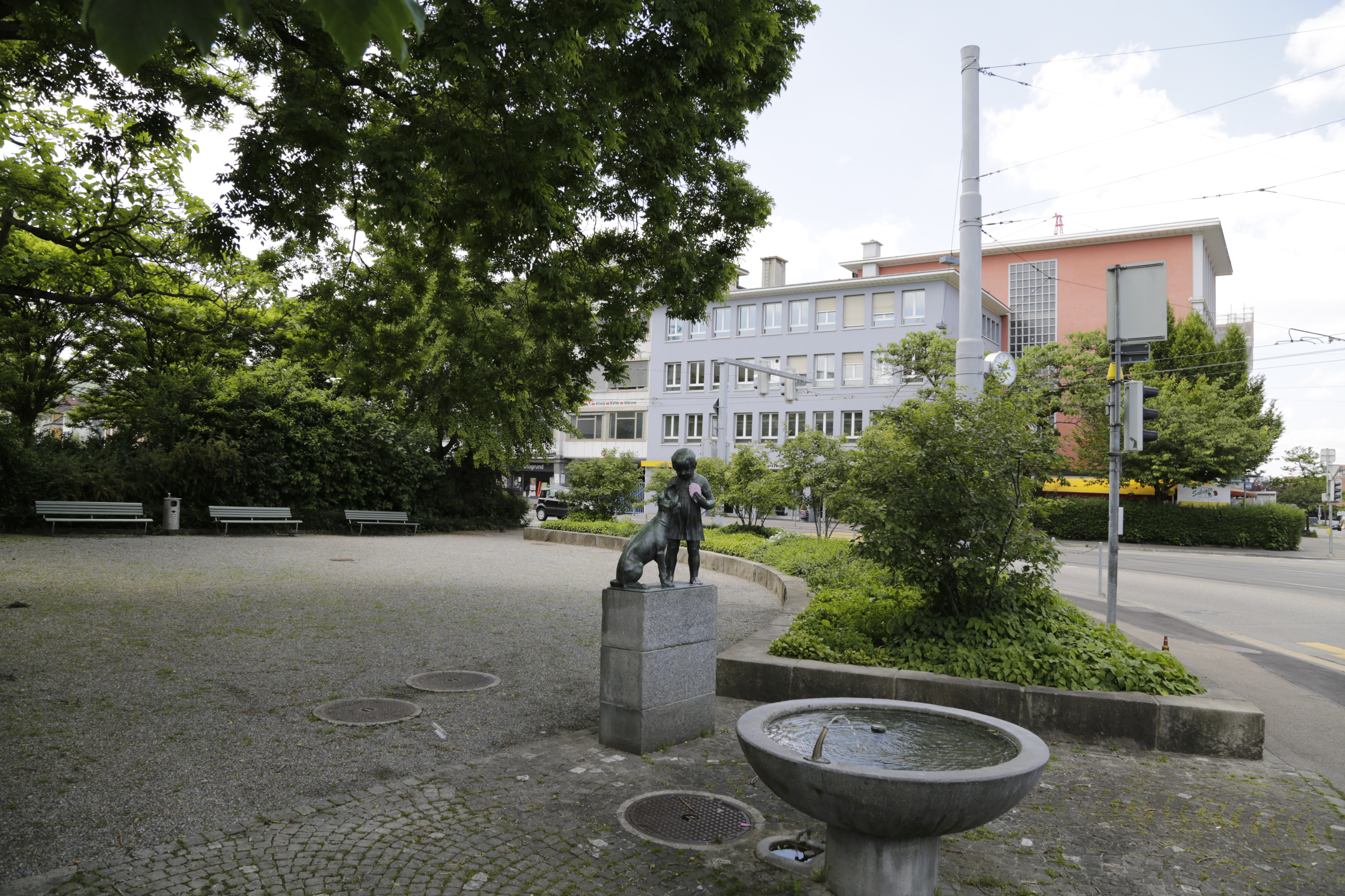 - Kliner Park an der Ecke Albisriedenstrasse/Rauti Strasse. Brunnen mit dahinterstehender Skulptur "Mädchen mit dem Hund" von 1936/37 von Adolf Ernst Hofmann