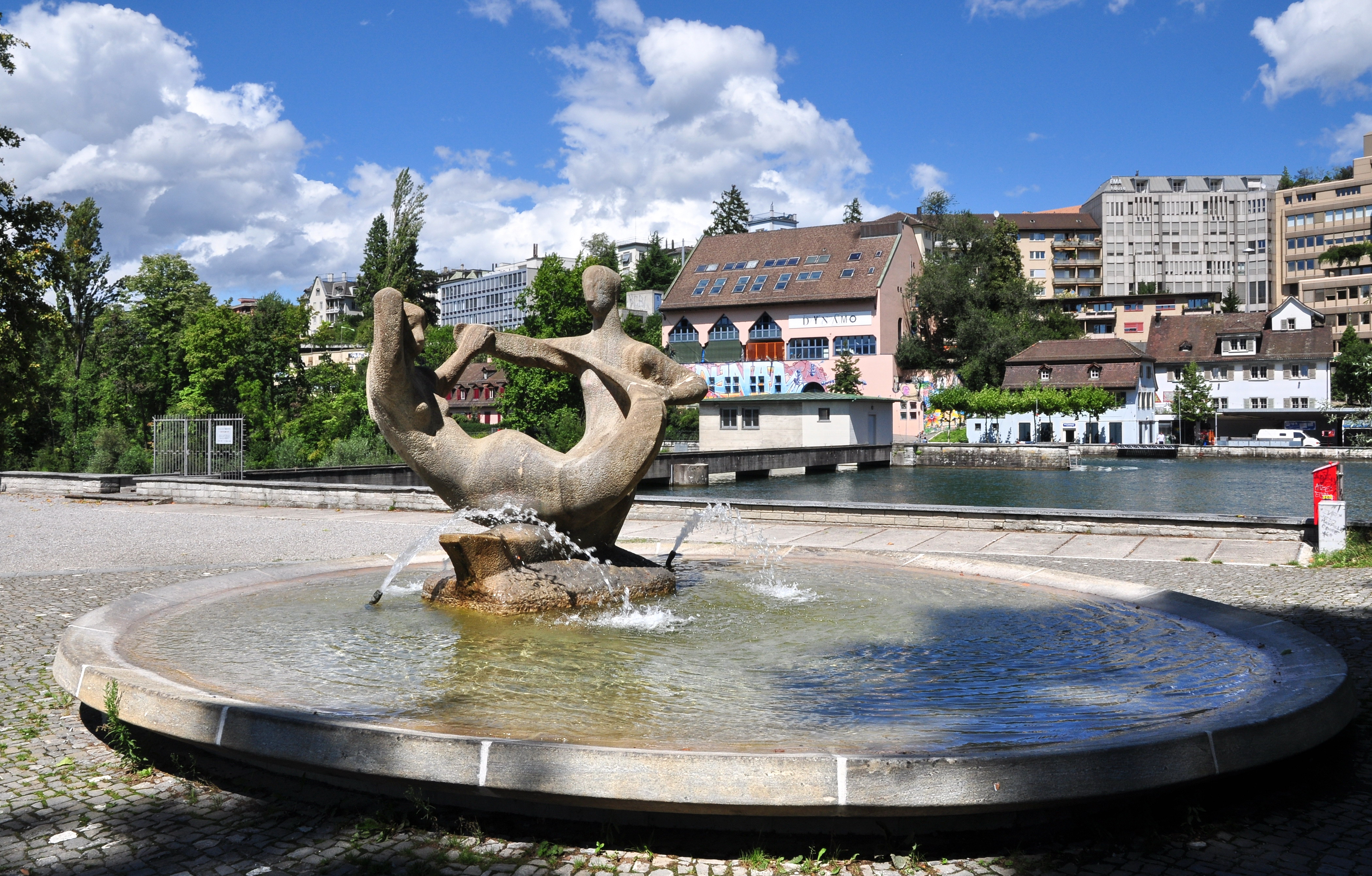 - James-Joyce-Plateau fountain at Platzspitz park in Zürich (Switzerland), Jugendkulturhaus Dynamo in the background.